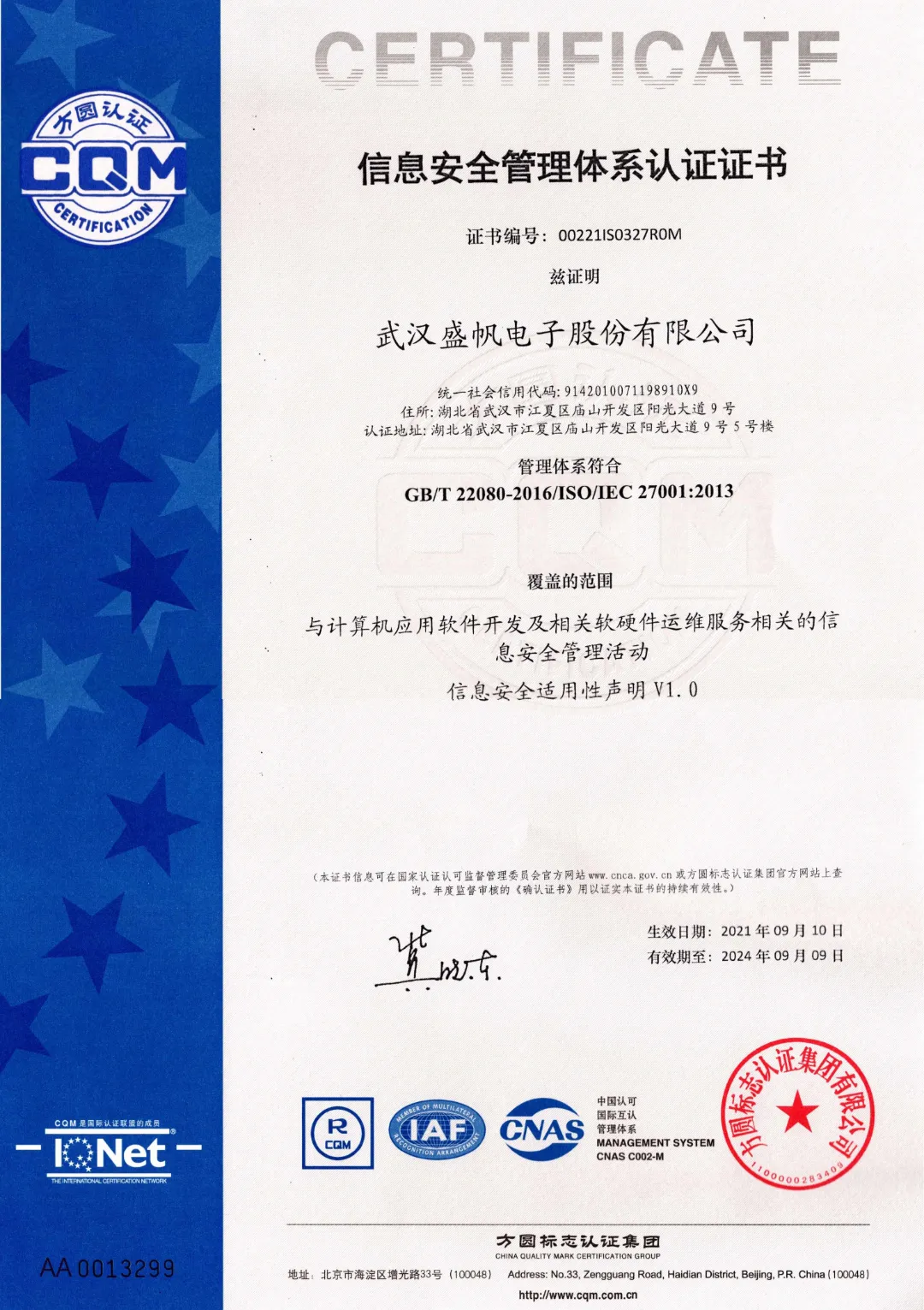 在數(shù)字經(jīng)濟時代,數(shù)據(jù)大規(guī)?;ヂ?lián)互通,信息安全是發(fā)展和流動的前提。隨著信息傳輸方式的多樣化發(fā)展,信息在存儲、處理和交換過程中,都存在泄密或被截收、竊聽和偽造的可能性,單一的保密措施已很難保證通信和信息的安全。此次通過認證,不僅標(biāo)志著盛帆股份對信息安全的管理已建立了一整套科學(xué)有效的管理體系,得到了權(quán)威機構(gòu)的高度認可,更表明盛帆股份擁有強大的技術(shù)能力為用戶信息提供可靠保障。