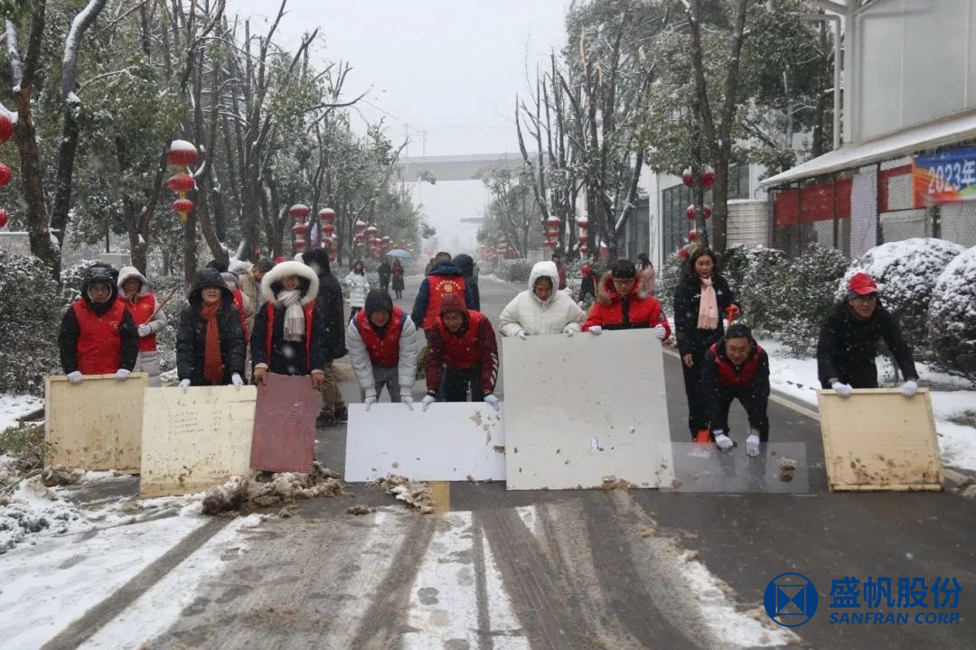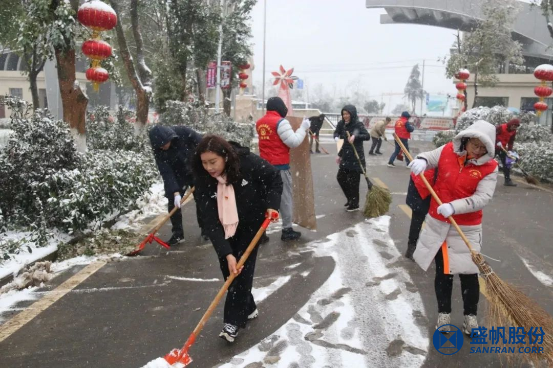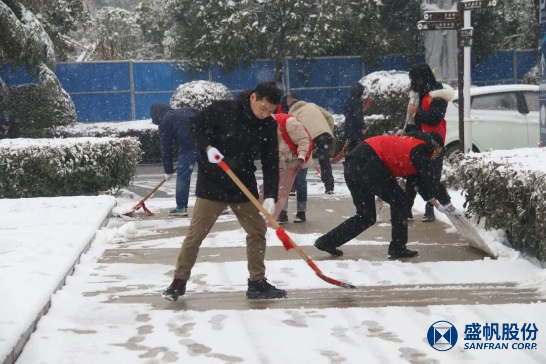 在困難面前,盛帆黨總支50余位黨員以雪為令、冒雪逆行,修剪被積雪壓垮的樹枝、清掃道路積雪,確保盛帆園區(qū)道路通暢,保障員工及家屬出行安全。在風(fēng)雪中為人民群眾筑起一道道堅固的“紅色堡壘”,讓黨旗在除雪保暢一線高高飄揚(yáng),讓黨徽在除雪保暢一線熠熠生輝!