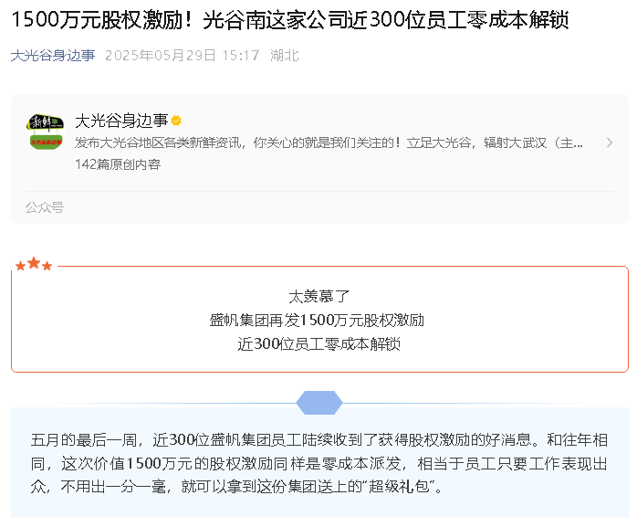 近期,武漢盛帆集團(tuán)近300位員工陸續(xù)收到了獲得股權(quán)激勵的好消息。和往年相同,這次價值1500萬元的股權(quán)激勵同樣是零成本派···