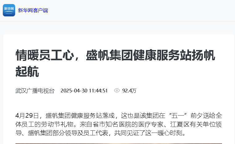 4月29日,伴著濃濃春意,盛帆集團(tuán)在盛帆工業(yè)園內(nèi)隆重舉行健康服務(wù)站落成剪彩儀式,來自知名醫(yī)院的醫(yī)療專家、武漢市江夏區(qū)···
