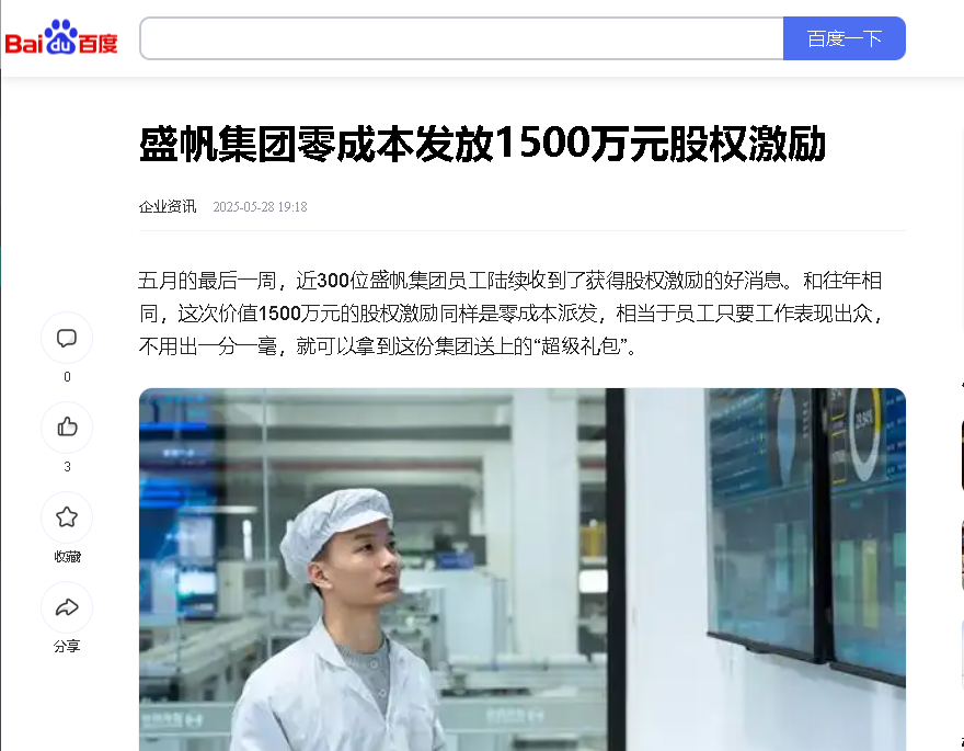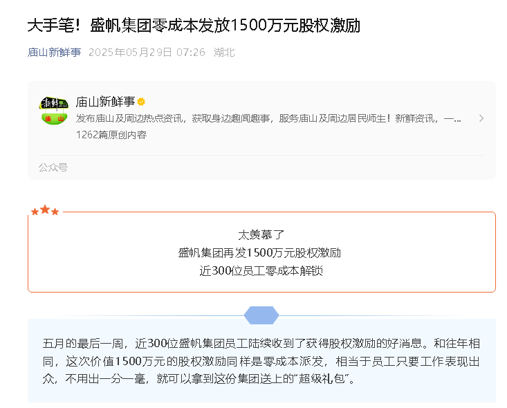 五月的最后一周,近300位盛帆集團(tuán)員工陸續(xù)收到了獲得股權(quán)激勵的好消息。和往年相同,這次價(jià)值1500萬元的股權(quán)激勵同樣是零成···